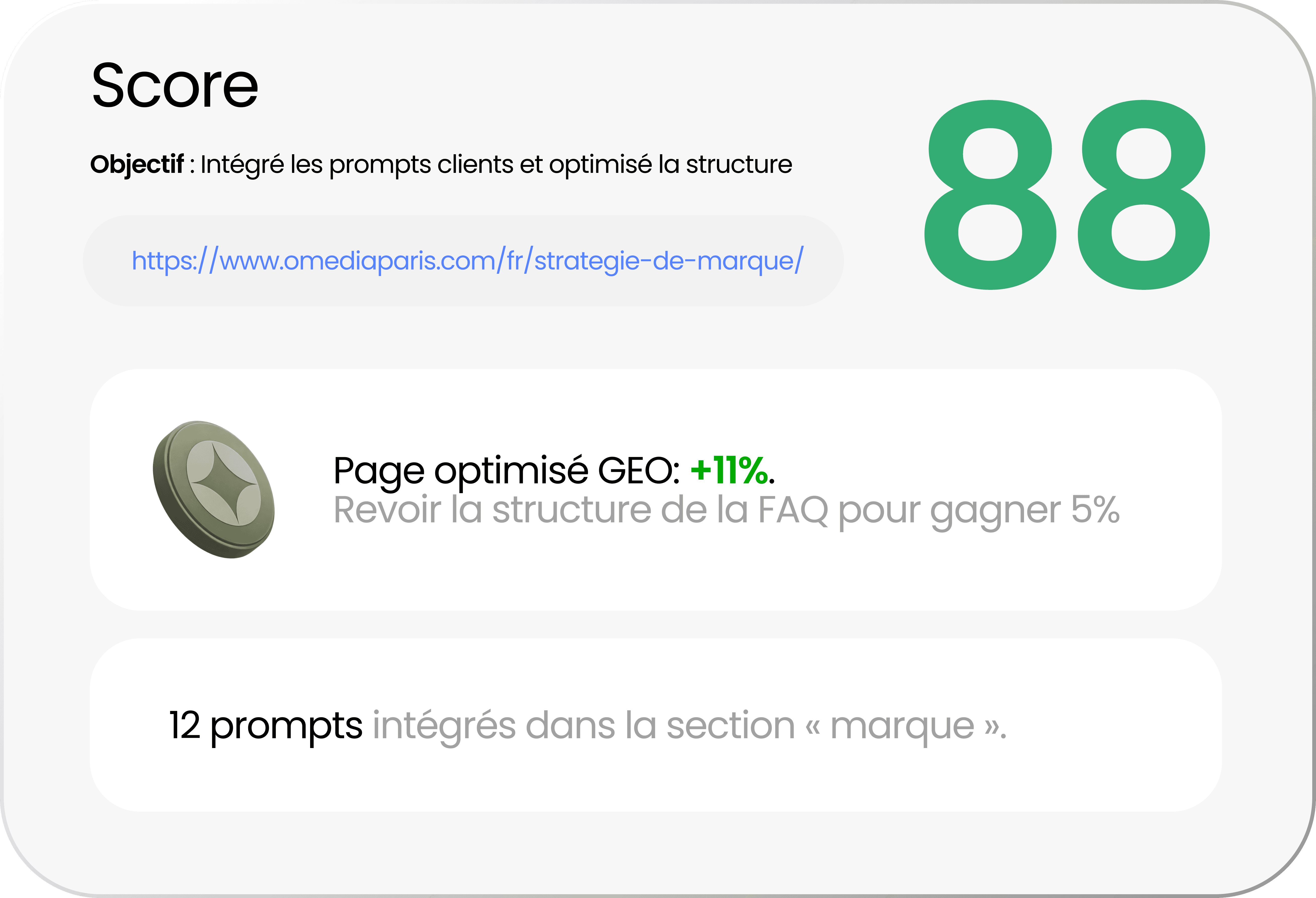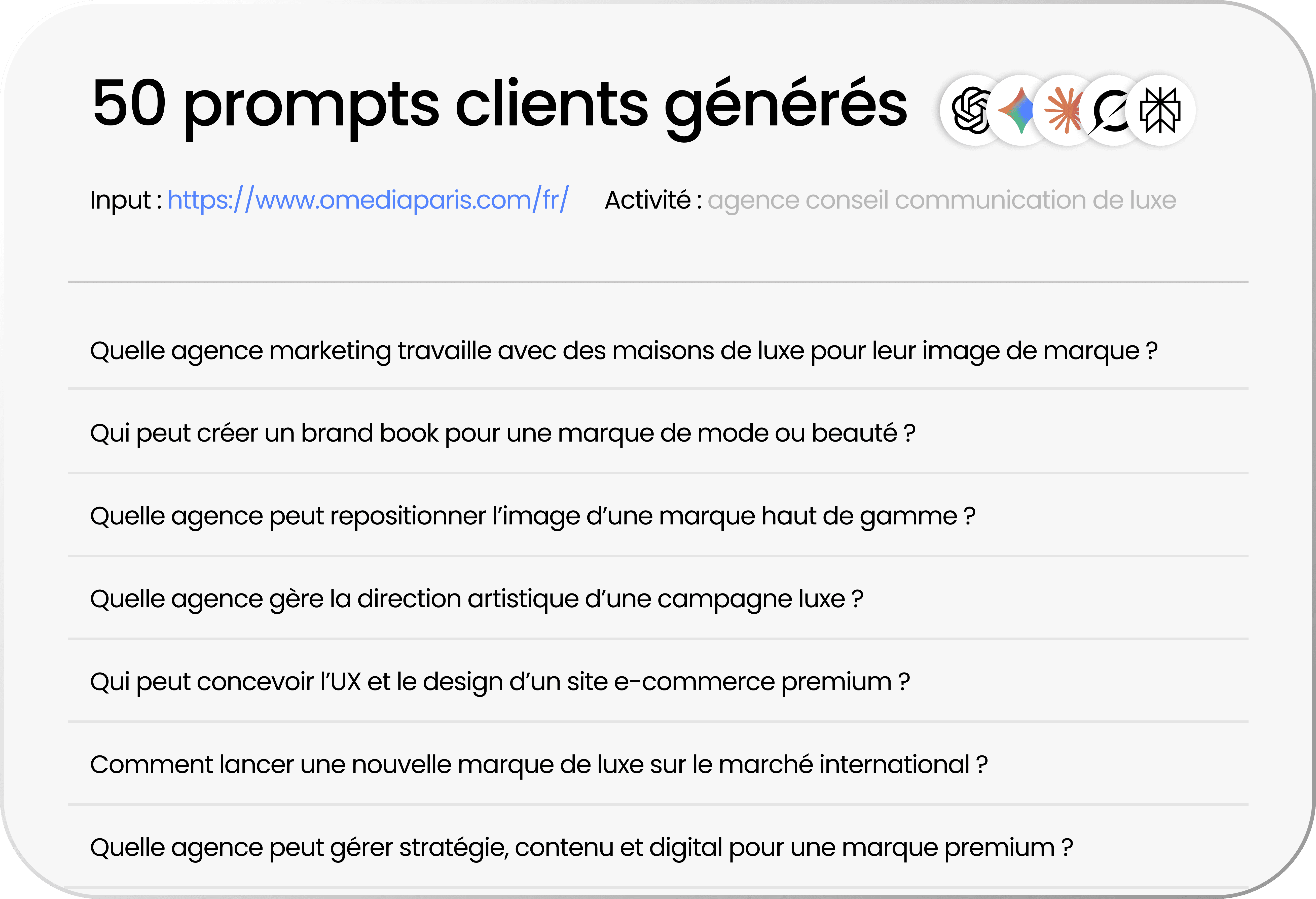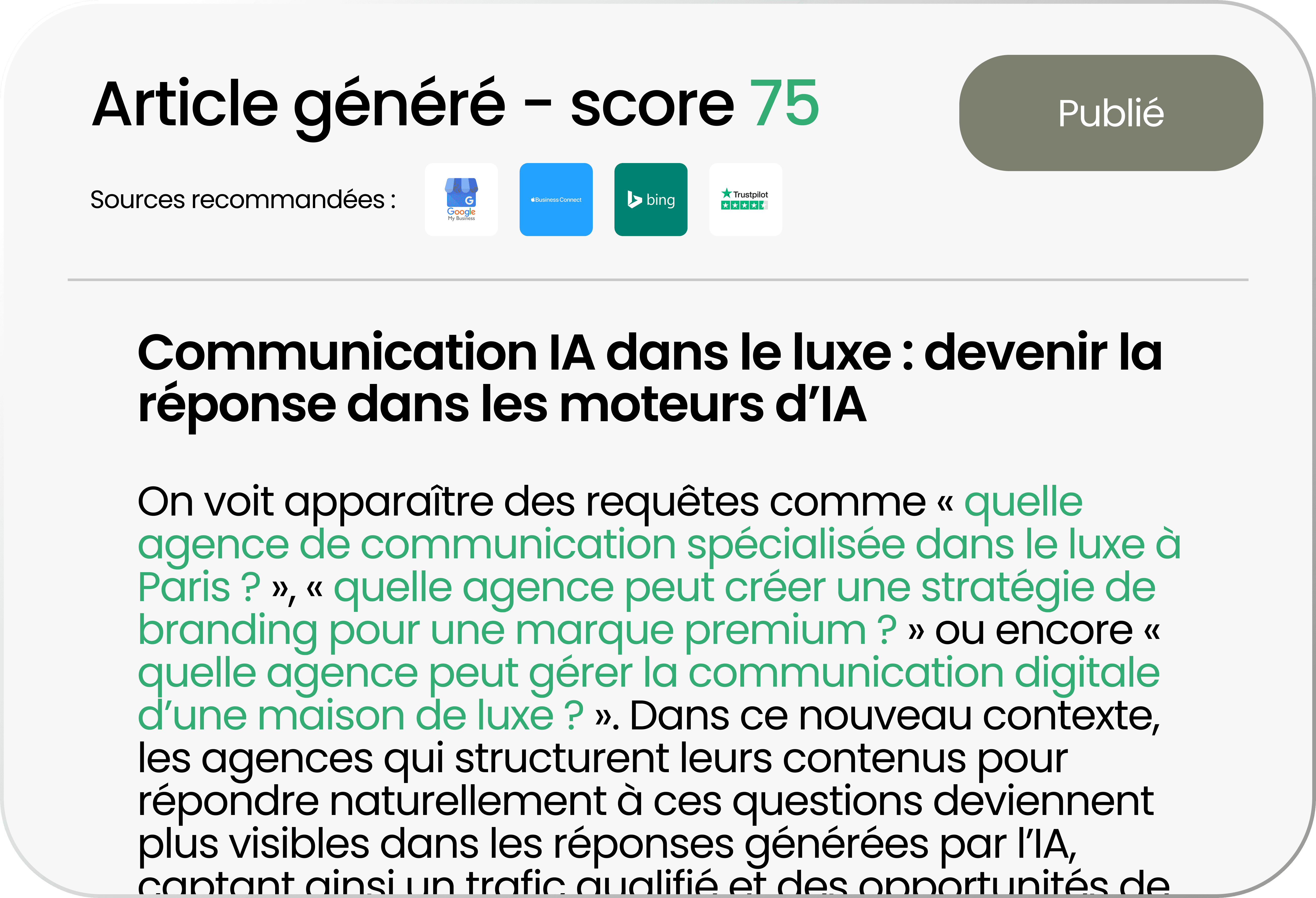 Pour apparaître dans les réponses des LLM, une marque doit produire des contenus structurés pour les moteurs de réponse IA. Cela passe par l’intégration de prompts clients réels, des contenus pédagogiques (FAQ, articles, guides), des sources crédibles et une structure technique exploitable par les LLM. Chez Frrank, nous analysons les requêtes du type “quelle agence marketing spécialisée en GEO ?”, “comment être visible dans ChatGPT pour son entreprise ?” ou “comment optimiser sa marque pour les moteurs d’IA ?” afin d’optimiser votre présence dans ces réponses.
